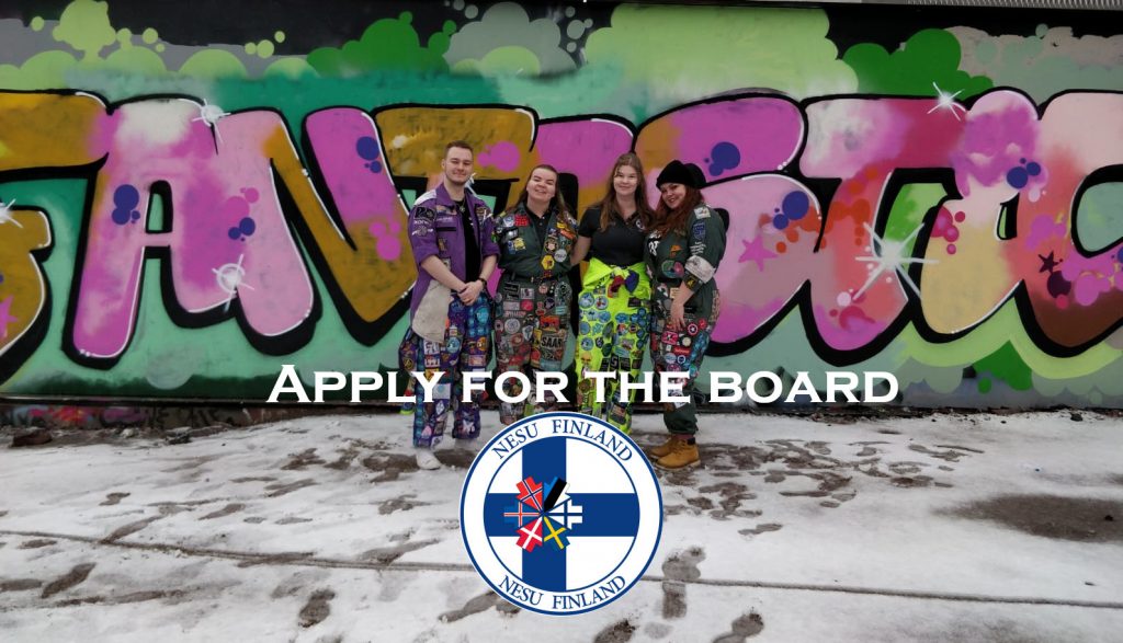 Send a free form application to be published in a group of the attendees in NESU Kesämöksä (the email: nesu-finland@nesu.net). Send your application at 26.7.20 23:59 at latest. The new board will start its active work in 1.9.20.
